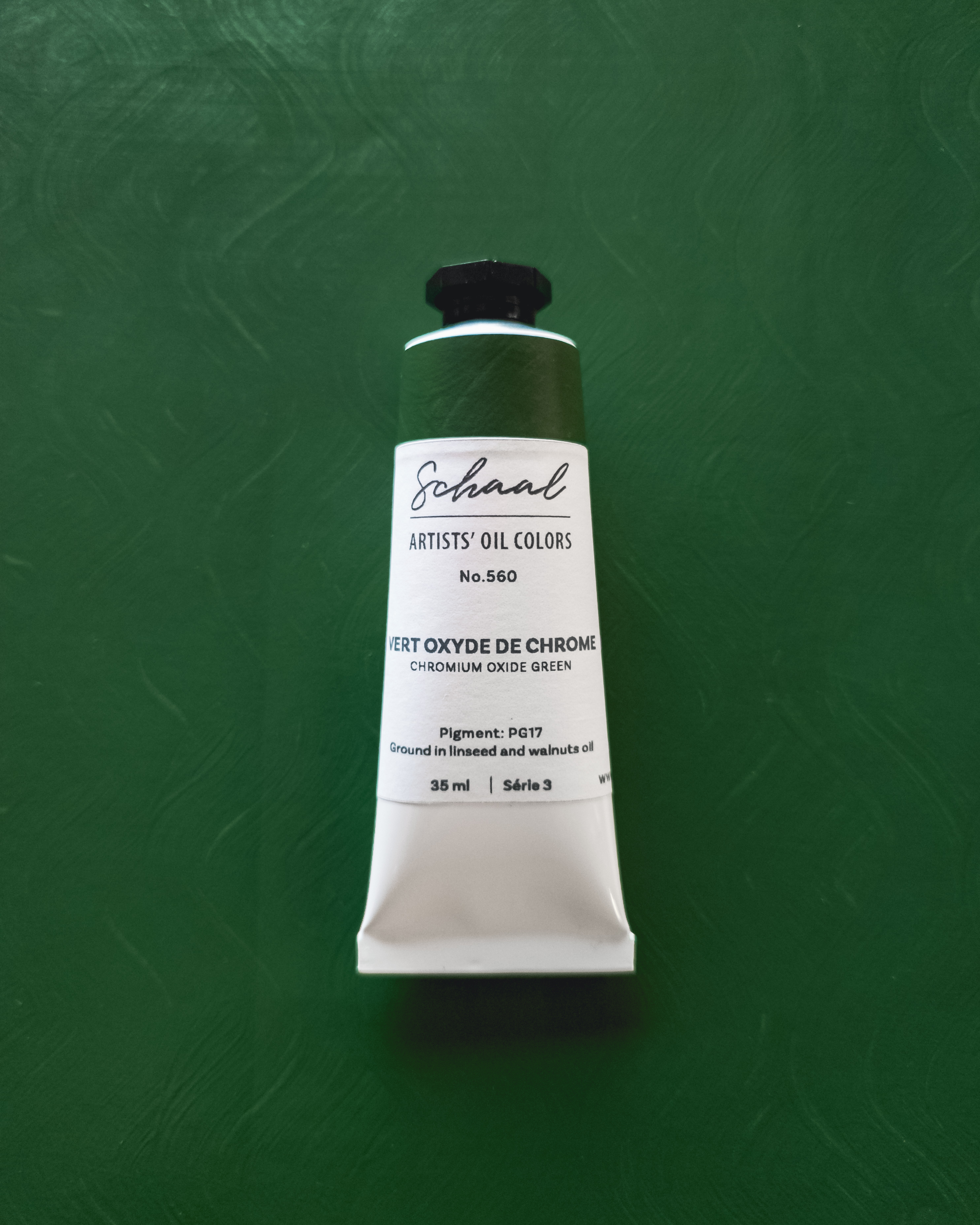 A timeless, muted vegetable green of great solidity (PG17 — chromium(III) oxide). Fully opaque with low tinting strength, it harmonises, anchors and naturalises in mixtures rather than dominating them. It is a staple landscape colour: enlivened with yellows for sunlit passages, deepened with reds for rich darks, refined with blues for atmospheric tones.